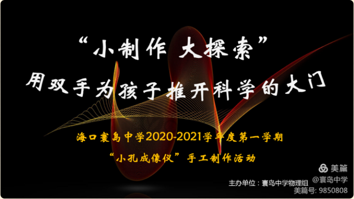 普及科学知识,激发学习热情,提高学生的观察能力、思考能力、动手能力、创造能力,11月9日,海口寰岛中学举办了“小制作 大探索 用双手为孩子推开科学的大门”小孔成像手工制作活动。
